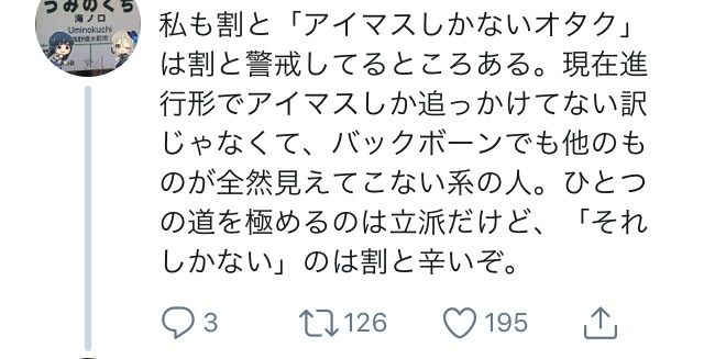 大体趣味がアイマスだけがヤバいんじゃなくて趣味に存在意義を見いだしてるやつがヤバいだけで