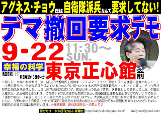 幸福の科学が香港民主活動家の周庭(アグネス・チョウ)氏の「守護霊霊言」と称するものを公開し、中国メディアを巻き込んで炎上している問題で、やや日刊カルト新聞社は9月22日午前11時半から幸福の科学・東京正心館(東京・高輪)前で抗議活動を行うと発表した。