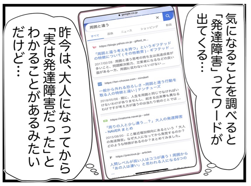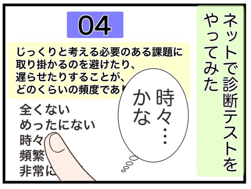 2019年09月22日 ②大人の発達診断テストをネットでしてみた【大人の発達障害編】 はじめましての方は→コチラ。前回の第1話はこちら!周囲に否定されてばかりだと、怖くなりませんか…?自分が気になっていること、悩んでることについて調べると、【発達障害】というワードがチラホラ出てきました。「もしかして自分はそうなのかな?」と思えてきて、何か、自分が前に進める手掛かりが掴めるならとらネット上にある【診断テスト】をやってみることにしました。テストの結果は…続きます。【↓読者登録してね】▼その他のエピソードはこちら。初めてうつ病になった話の第1話はコチラ。産後にうつ再発編の第1話はコチラ。113話【番外編】もあります。(中傷被害に遭った話の後日談です。)【娘(第一子)出産話】の第1話はコチラ。看護学生時代の話↓【本当にあった病院での心霊現象】子どものケンカ編の1話目はこちら。↓書籍発売中です!息子の出産話を描き下ろしました!うちの子の場合! 子育てが10倍楽しくなる!出産&育児コミックエッセイ (メディアファクトリーのコミックエッセイ)カフカヤマモト2017-04-28※電子書籍もあります! 「わたくしごとですが。」カテゴリの最新記事 ①周囲と自分だけが違う?【大人の発達障害編】 【ネタバレなし】映画『ハローワールド』観てきたよ! 15・帰りの飛行機でこのオチ【潜在看護師編】 14・急病人の変わり様がすごい!【潜在看護師編】 13・ブランクがある看護師はこうなる?【潜在看護師編】 12・看護師だけど、情けない…【潜在看護師編】 11・低血糖、何分くらいで回復する?【潜在看護師編】 ⑩低血糖になるの初めてなのかな?【潜在看護師編】 ⑨急病の原因がわかった瞬間【潜在看護師編】 ⑧看護師免許はあるけども【潜在看護師編】 タグ :大人の発達障害発達障害人間関係悩み個性自己肯定感発達相談メンタルクリニックメンタルADHD < 前の記事