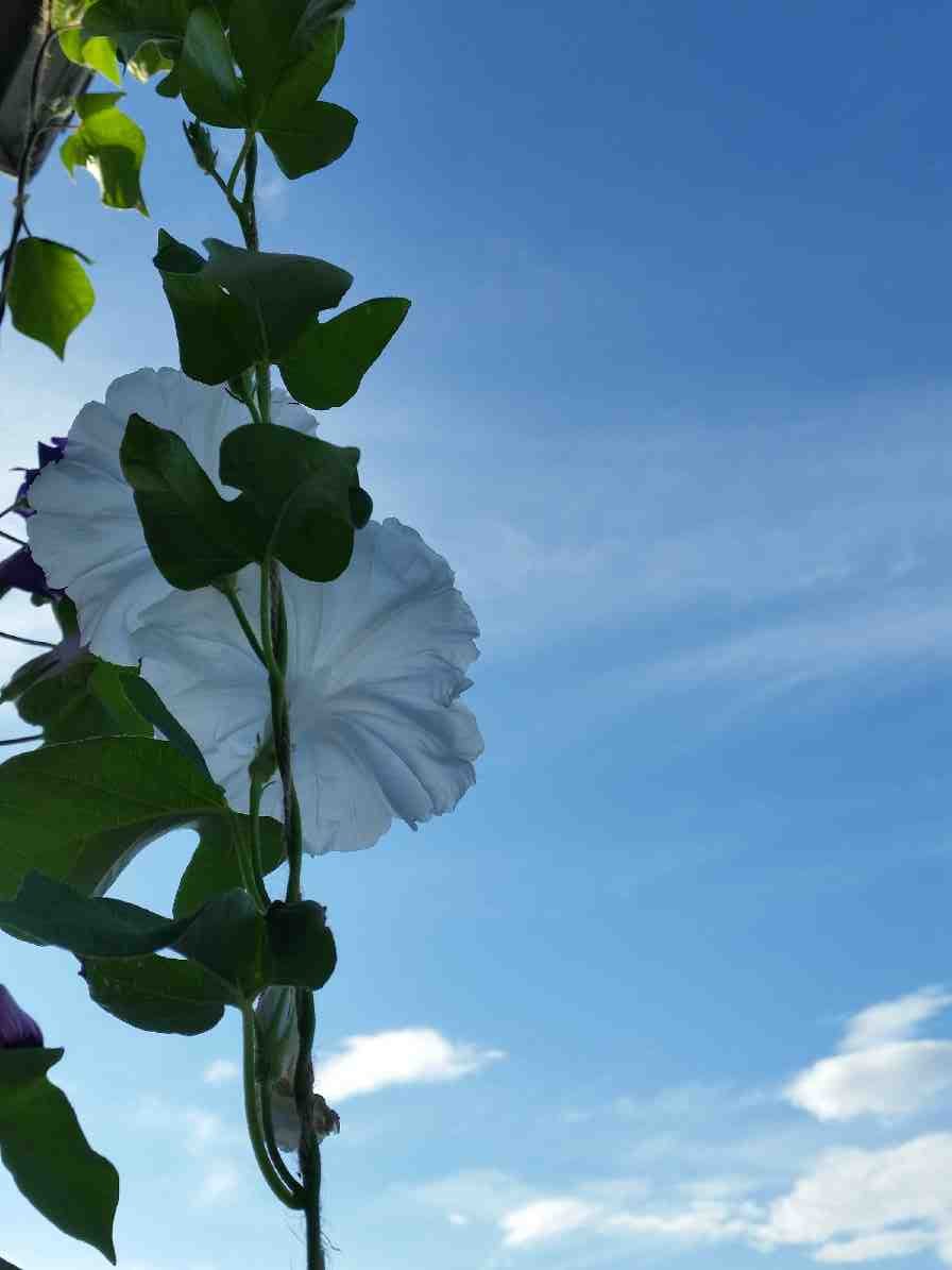白い朝顔の花はやはり青空に映えますね。
