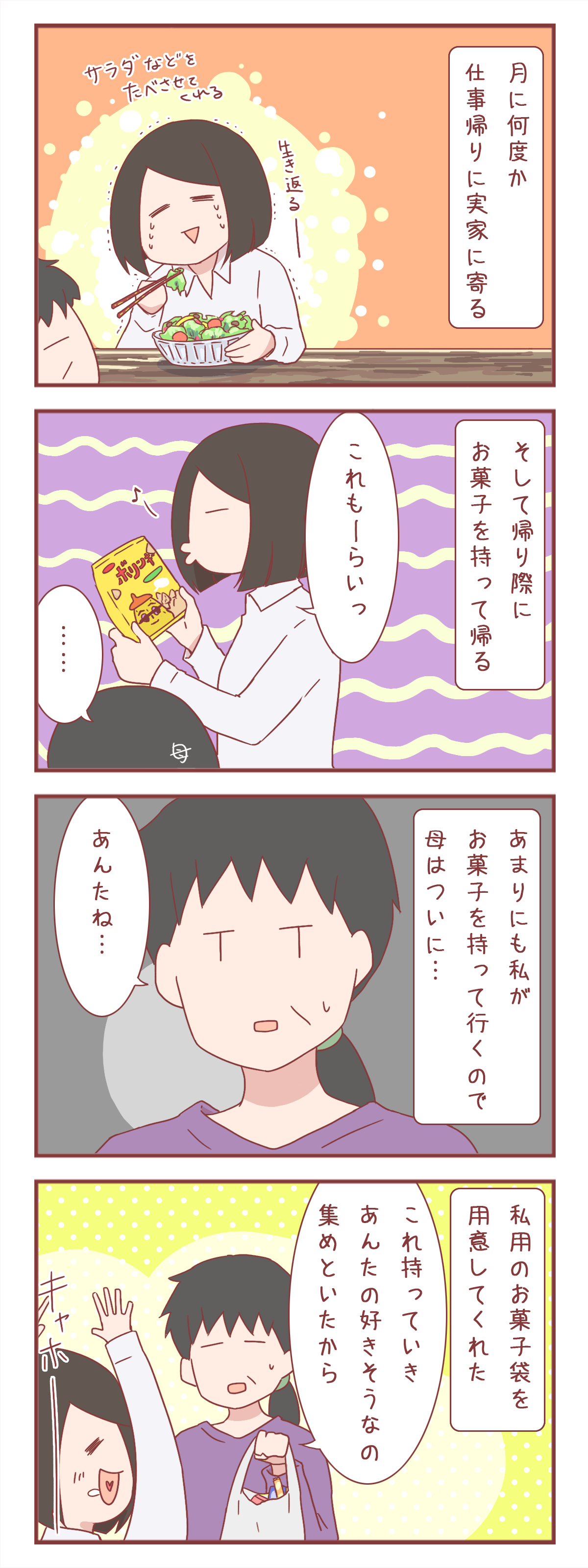 最近は忙しくてあまり帰れていないのですが、同棲したての頃や、入籍してすぐの頃は割としょっちゅう実家に寄っていました。その都度、実家に置いてあるお菓子を持って帰ろうとする私に、母は…