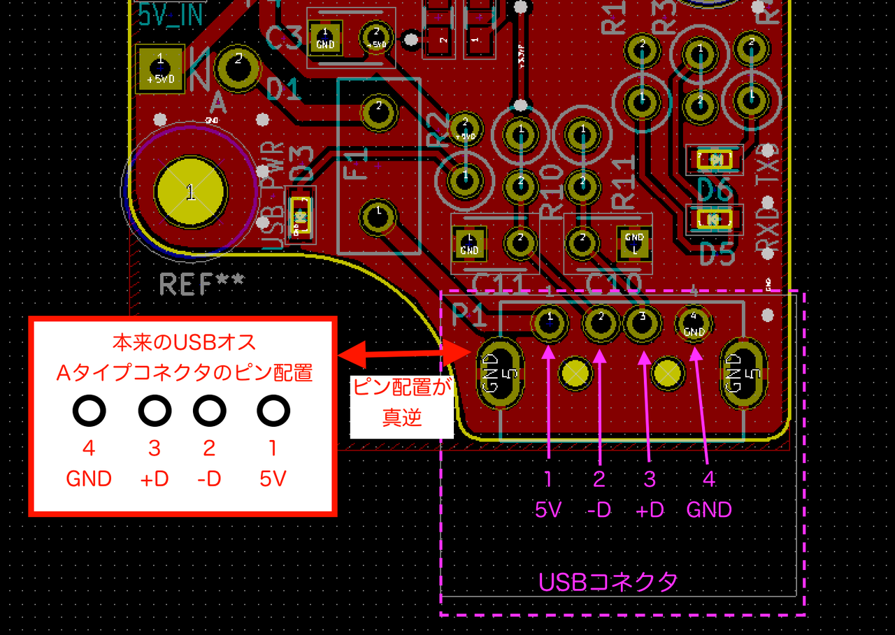 USBのAコネクタであればフットプリントは大体同じだろうと思い込み、コネクタ固定端子の形状違いやピン配置が逆になるということがすっぽりと抜け落ちていました。。。