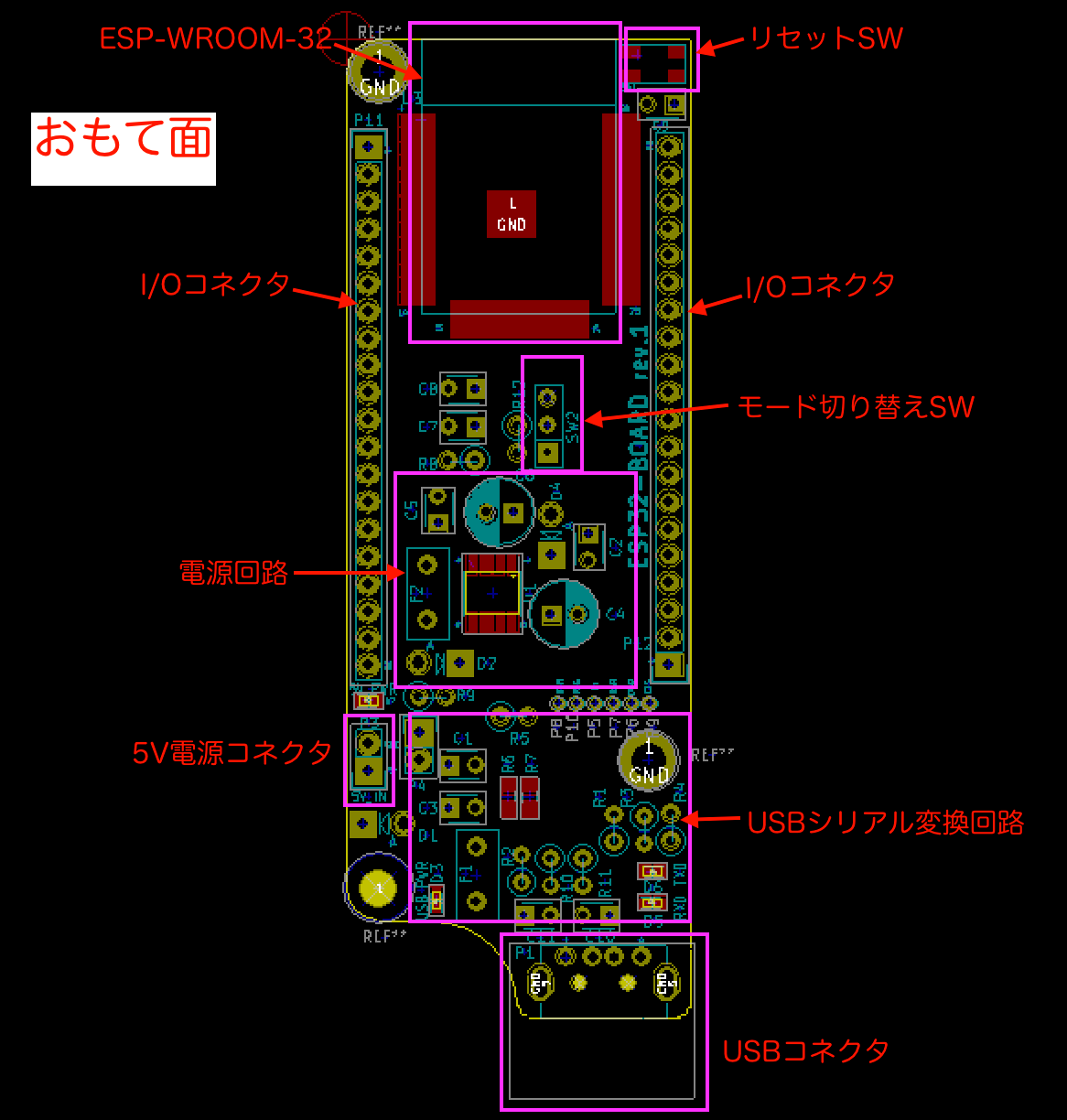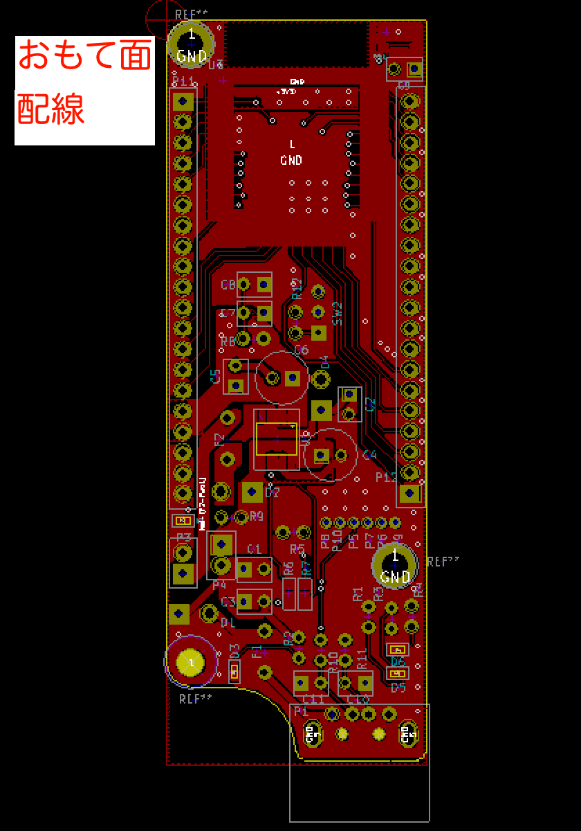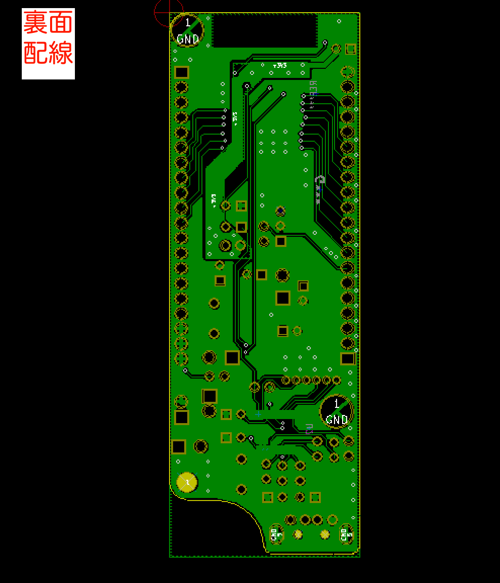ESP-WROOM-32とI/Oコネクタ間の配線でGNDベタが分断されてしまって、電源回路とESP側のGND接続がやや細くなってしまいました。