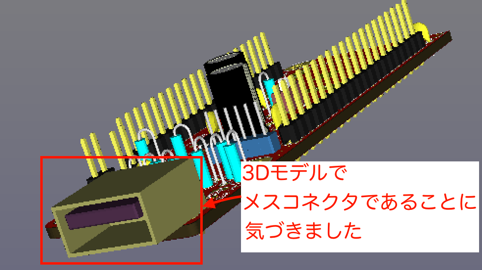 の記事でも書いた内容ですが、USBメス(Aタイプ)コネクタのフットプリント をオスのAタイプコネクタと勘違いして使ってしまっていました。