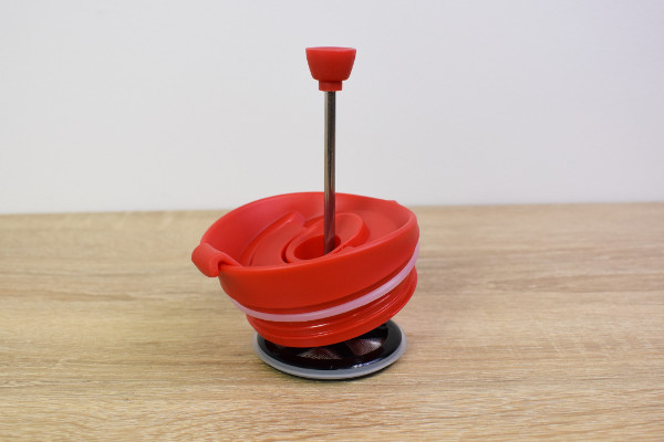 抽出が終わったところで、プランジャーをプッシュ。特に力を入れる必要はなく、スーッと容器の奥まで入り込みます。これでコーヒーはできあがり。早速コップに注いでみると、湯気と共にコーヒーのこうばしい香りが。フィルターが隙間なくコーヒー豆を密閉するおかげで、カスが混ざることもありません。これなら安心して淹れたてのコーヒーが飲めますね。