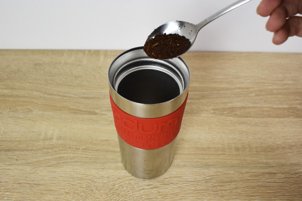 それでは、試しにコーヒーを作ってみましょう。まずは挽いた豆を容器にイン。豆の分量は、カップ1杯(120cc)につき7gが目安です。次に新鮮な水で沸かしたお湯(90℃~96℃)を注ぎ、マドラーなどで軽く混ぜたら4分間抽出してください。