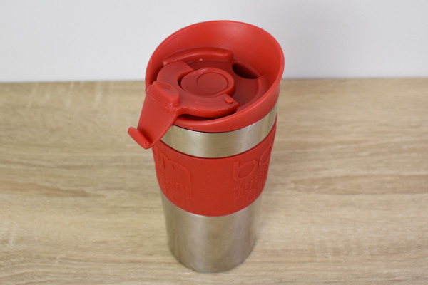 銀と赤のツートンカラーがクールな同商品。サイズは約8.0(直径)×18.5cm(高さ)、容量は0.35Lほどです。本体はステンレススチール製ですが、赤色の持ち手部分はシリコンで作られているため持ちやすさはバツグン。しかし、一見普通のタンブラーにしか見えません。
