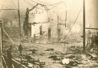 中華民国の上海市の閘北地区に対して、日本軍が日華事変による1936年の第二次上海事変よって、火器と爆撃による最前線における凄惨なる兵火と遺体が散在する跡である。