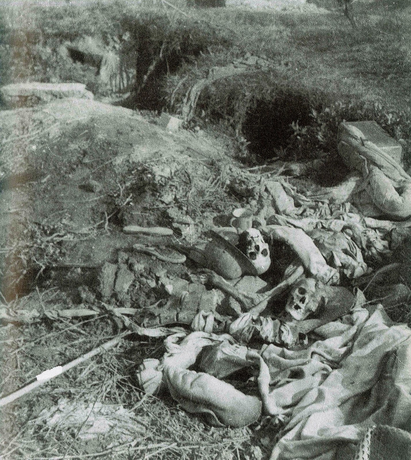 日本軍により生活していた中国人が惨殺されて、くぼ地に放置されて多くの白骨死体となり、その生活用品と共に残存している。