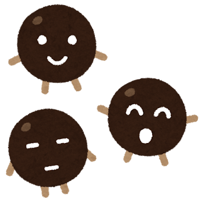 タピオカの黒い粒に顔と手足が描かれたイラストです。