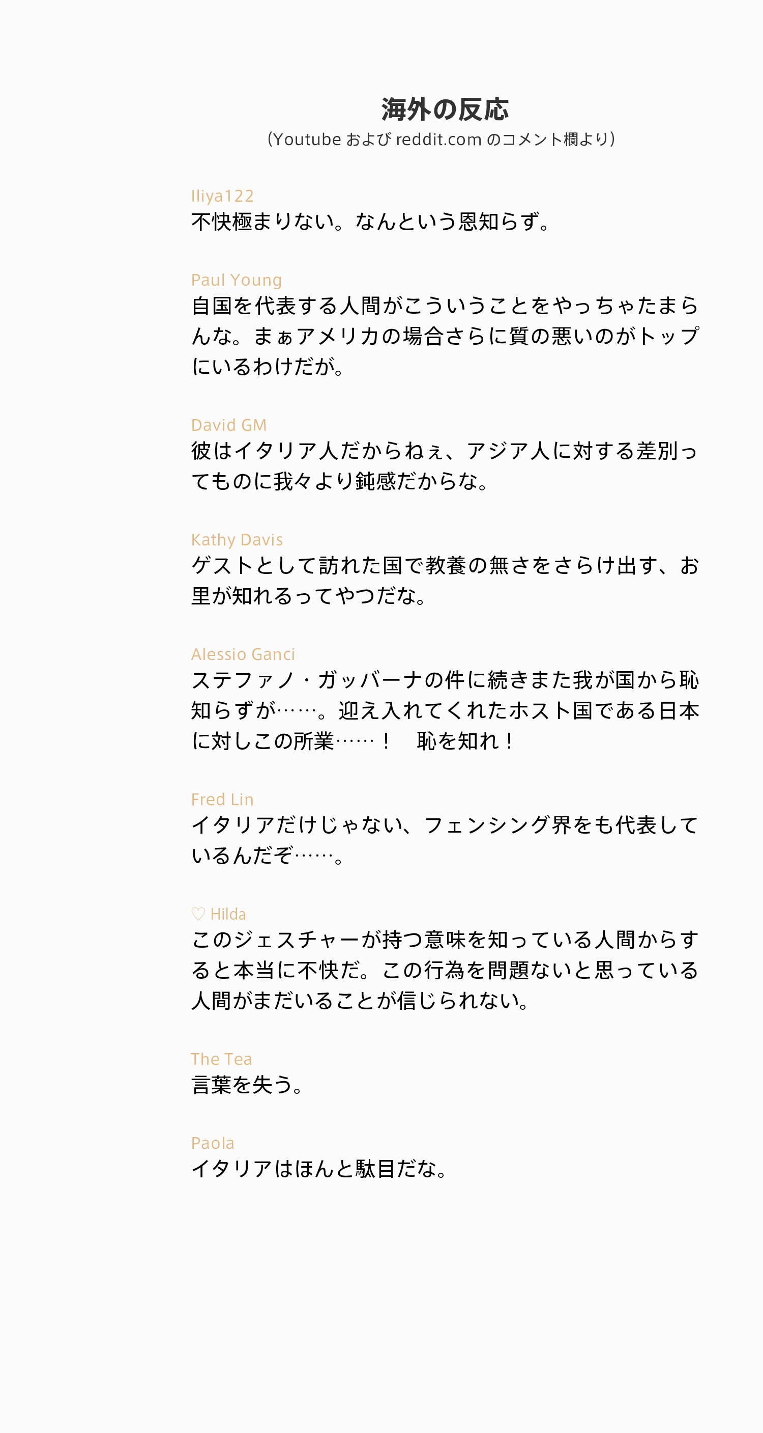 - 『車椅子フェンシングの世界王者、日本人を侮辱する差別的なジェスチャーをして炎上』(KAIKORE 2018.12.14)