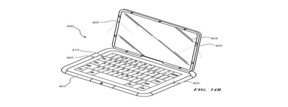 特許には、「補助的なケースはコンピューティングデバイスのキャリーハンドルや物理的な支えになる」と記されています。これはケースがハンドルやスタンドになることを意味しています。