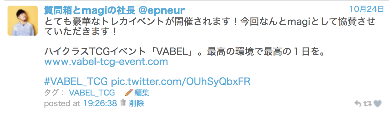※magiの社長も協賛すると宣言していましたが、その後ツイートを削除。VABELのHPの協賛企業リストに、magiの名前はありません。どうしたんでしょ?