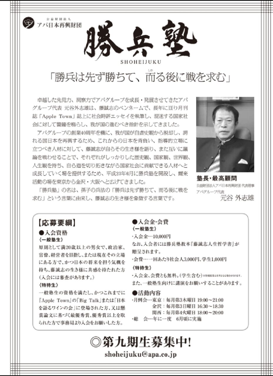 勝兵塾はアパグループの創業40周年を記念して2011年につくられたウヨい私塾です