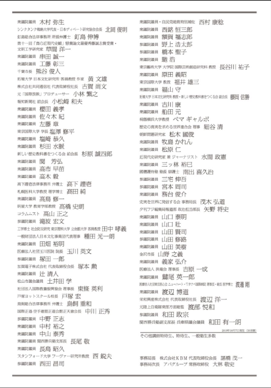 衛藤晟一内閣府特命担当大臣や稲田朋美元防衛大臣をはじめ、極めてウヨい議員連中が名を連ねていますね。2019年9月11日発足の第4次安倍再改造内閣では5名の閣僚が勝兵塾の特待生です(もう辞めた人もいるけどね!)