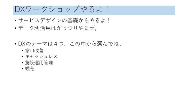 DXワークショップやるよ! • サービスデザインの基礎からやるよ! • データ利活⽤はがっつりやるぜ。 • DXのテーマは4つ、この中から選んでね。 • 窓⼝改善 • キャッシュレス • 施設運⽤管理 • 観光