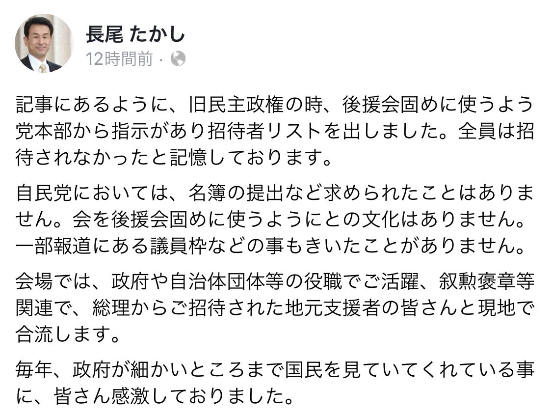- 【桜を見る会】元民主の自民・長尾たかし議員「旧民主政権の時、後援会固めに使うよう党本部から指示がありリストを出した」