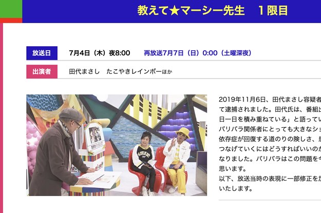 2019年11月6日、田代まさし容疑者が薬物を所持していたとして逮捕されました。田代氏は、番組出演時に「薬物に頼らない一日一日を積み重ねている」と語っていただけに、逮捕の知らせはバリバラ関係者にとっても大きなショックでした。そして、薬物依存症が回復する道のりの険しさ、患者を孤立させず社会復帰につなげていくにはどうすればいいのか、をより深く考える機会となりました。バリバラはこの問題を今後も考え続けていきたいと思います。