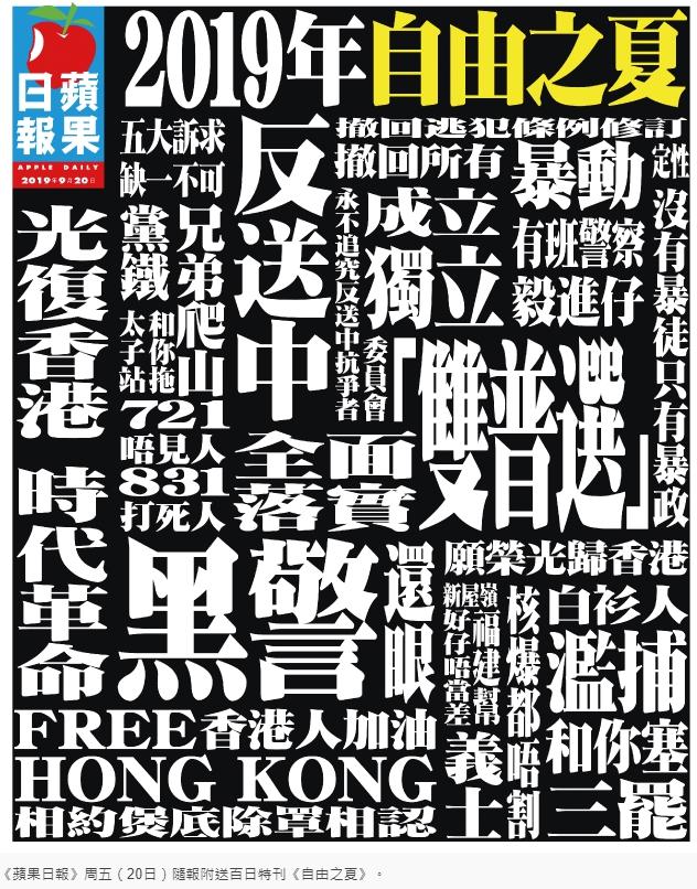 特に有名なものの1つが、自由主義を標榜する反北京・親民主派の代表的な香港の新聞『蘋果日報』の香港デモを特集した特別号の表紙だ。
