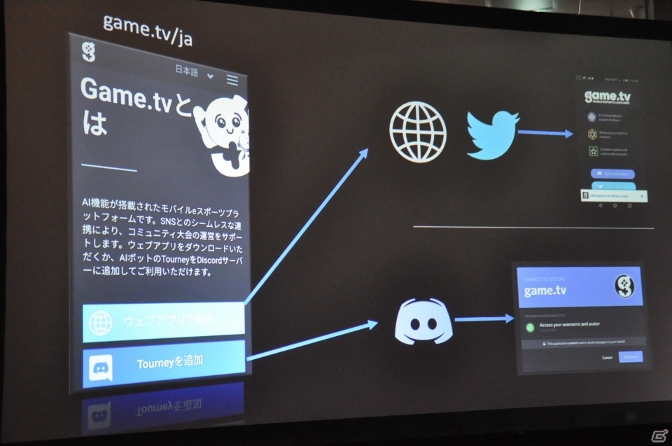 具体的な使用方法についてだが、本サービスはゲーム関連のコミュニティが多く存在するDiscordやTwitterと連携し、既存のコミュニティからシームレスに大会を運営することができる。「Game.tv」のウェブアプリにDiscord・Twitterアカウントでログインし、大会作成後はワンタッチでSNSへ投稿。また、DiscordにはAIボット「Tourney」を直接プラグインすることも可能だ。