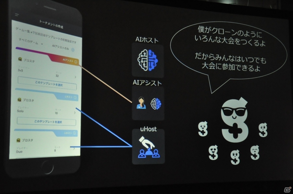 新しく大会を開催する際は、幾つかのテンプレートを使うことで誰でも簡単に作成することができる。自分で全てをカスタマイズする“uHost”に加え、AIが半自動的に大会を開催・運営してくれる“AIアシスト”の2つの方法がある。大会を作成すると、SNSと連携して自動でお知らせが告知される。既存のコミュニティの中で連携されるので、新しくコミュニティを作る必要がないのが本サービスの特徴だ。