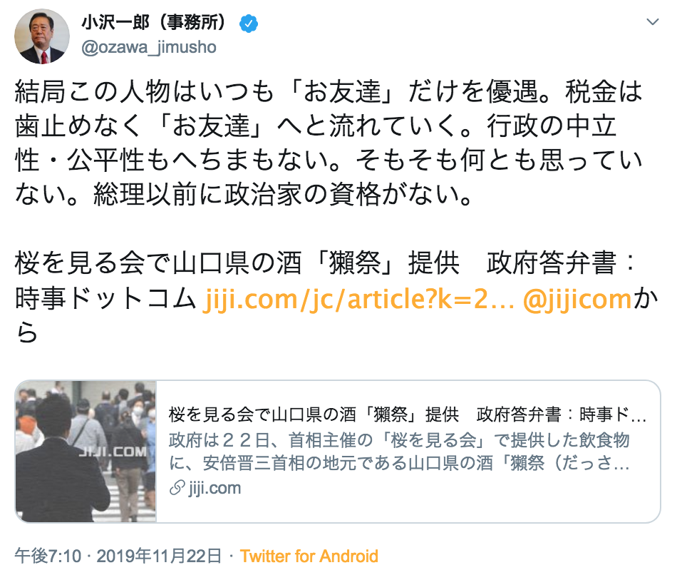 - 【桜を見る会】小沢一郎氏、安倍首相を批判「いつも『お友達』だけを優遇。税金は歯止めなくお友達へ。総理以前に政治家の資格無し」