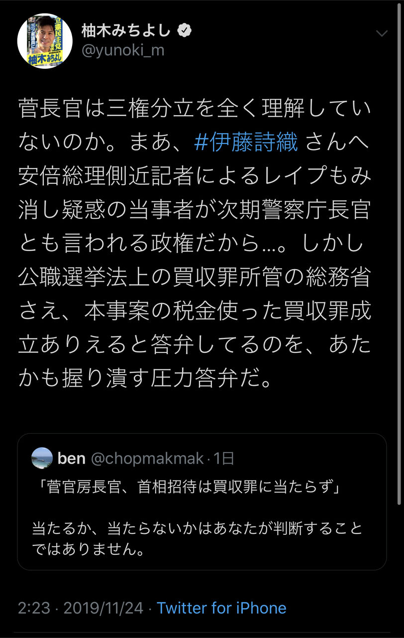 菅長官は三権分立を全く理解していないのか。まあ、#伊藤詩織 さんへ安倍総理側近記者によるレイプもみ消し疑惑の当事者が次期警察庁長官とも言われる政権だから…。しかし公職選挙法上の買収罪所管の総務省さえ、本事案の税金使った買収罪成立ありえると答弁してるのを、あたかも握り潰す圧力答弁だ。 https://twitter.com/chopmakmak/status/1197705754867720192 …