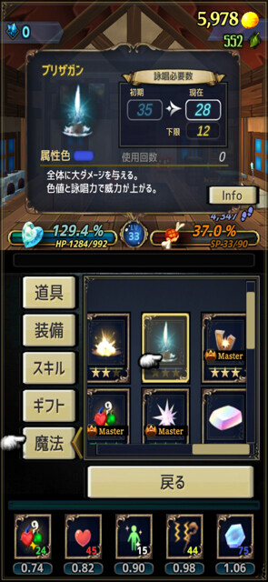 魔法を覚えると、バトル中に消したジェムの色の魔力がたまり、同じ色の属性を持つ魔法が使えるようになる。