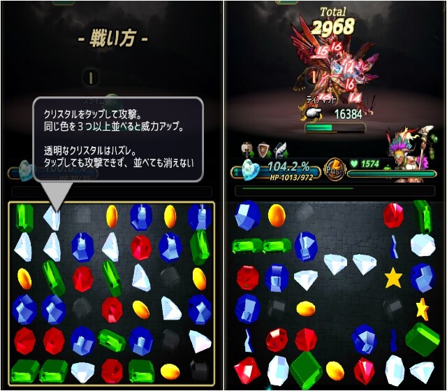 バトルは積み上げられたジェムを消すパズルゲーム要素を取り込んでおり、ジェムをタップすると壊せて、壊したジェムの数に応じて主人公が攻撃を行うものとなっている。