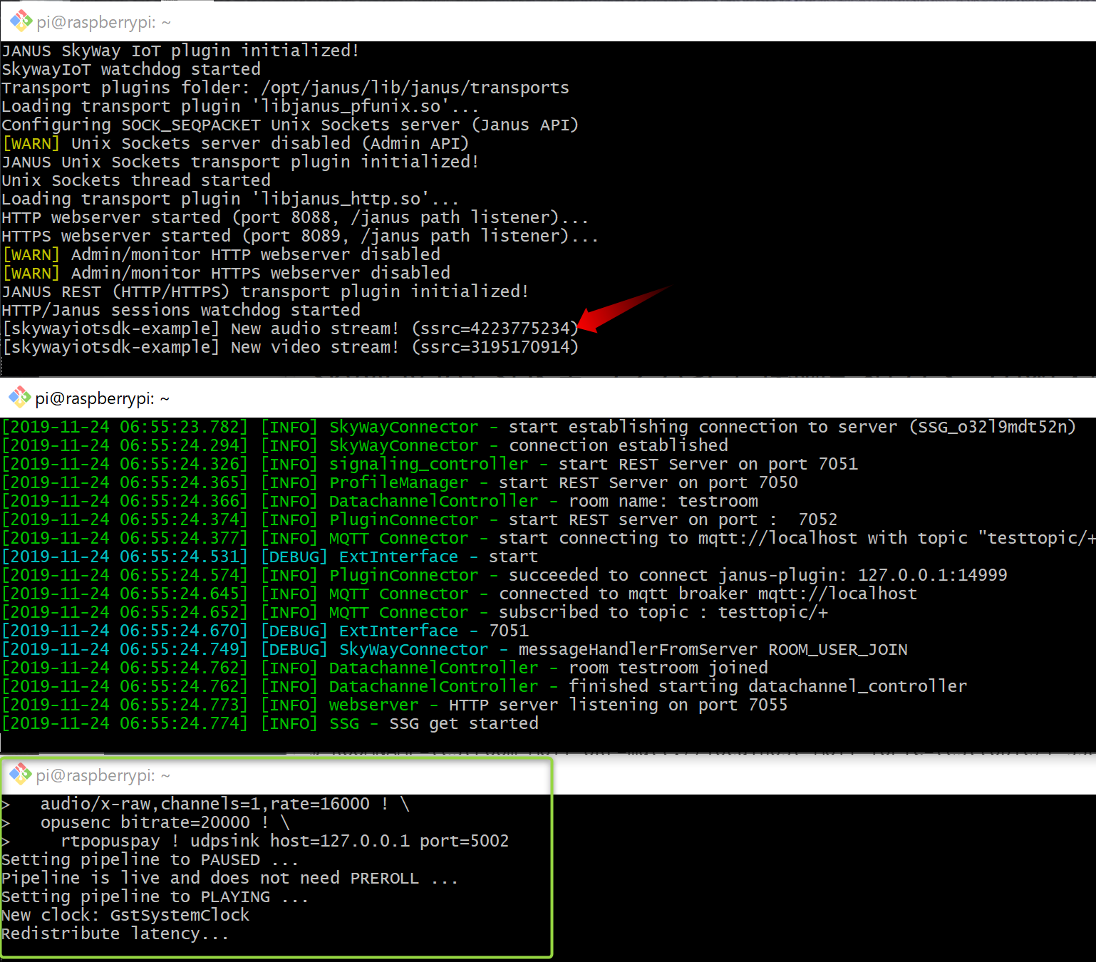 ラズパイで3つのコマンドを実行するためssh接続のターミナルを3つ用意して、それぞれ以下のコマンドを実行します。