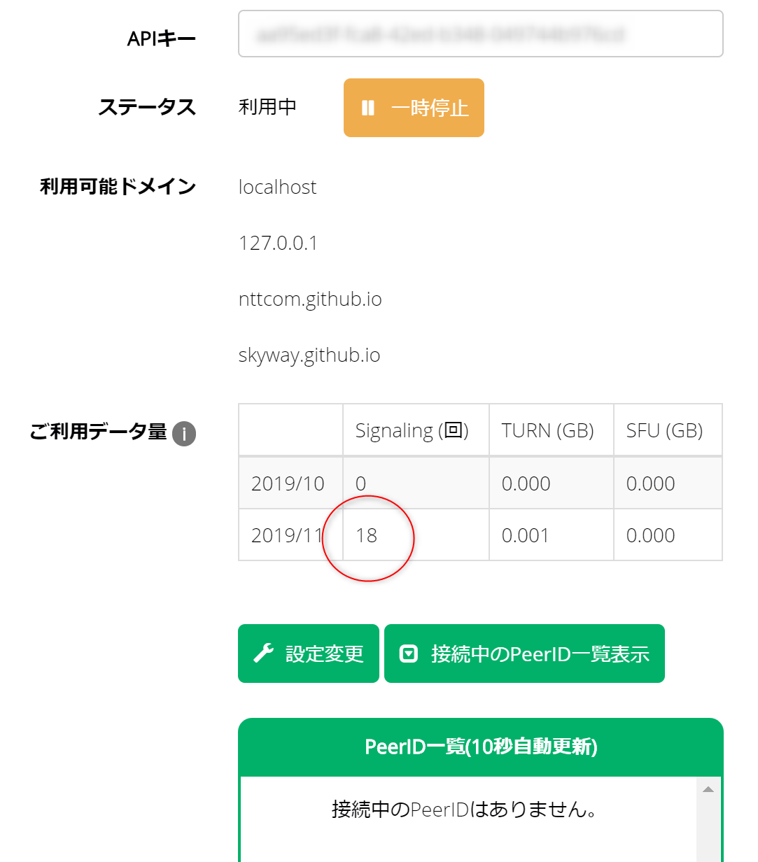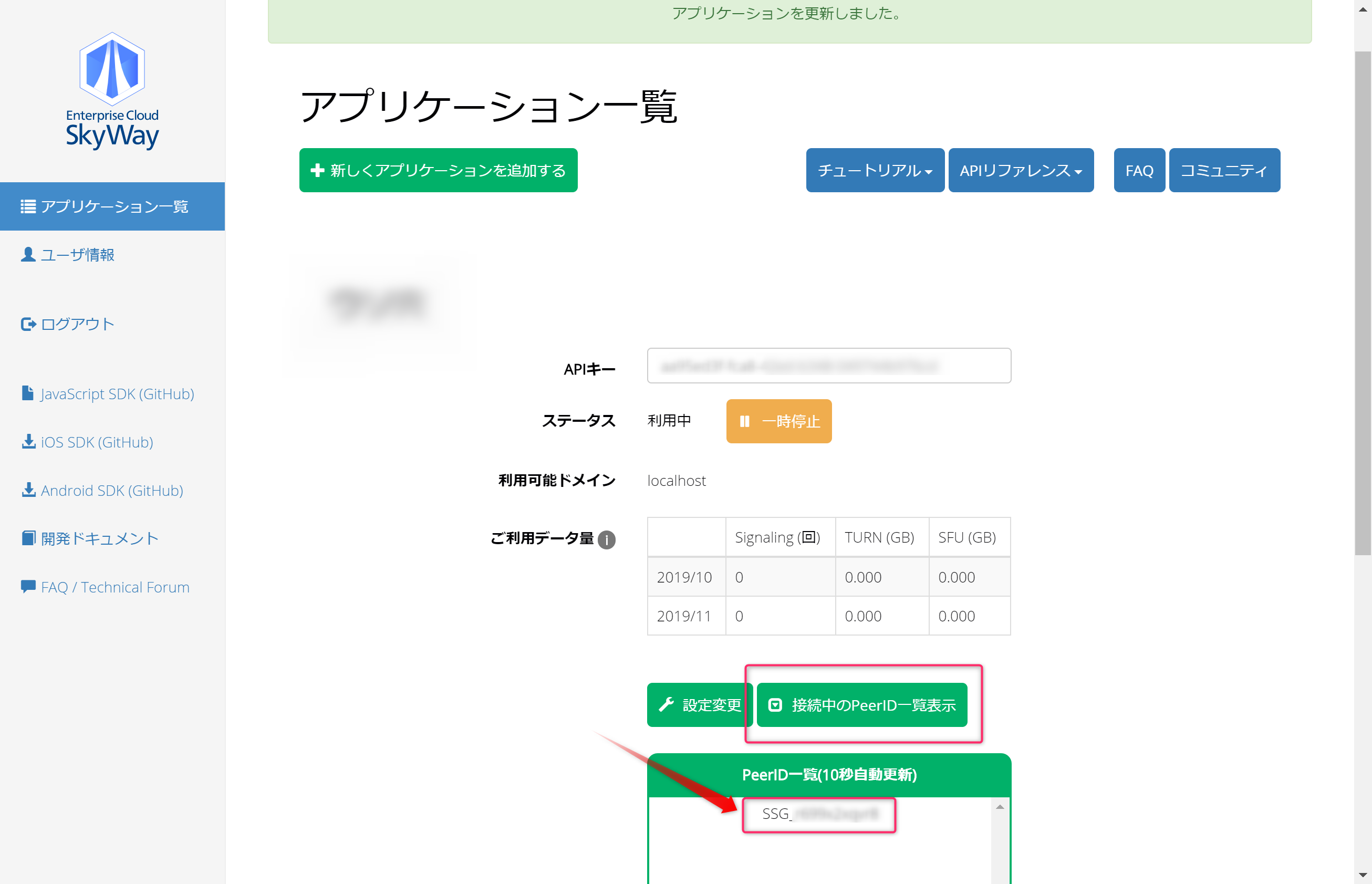 登録したアプリケーション管理画面を開き、接続中のPeerIDを確認します。