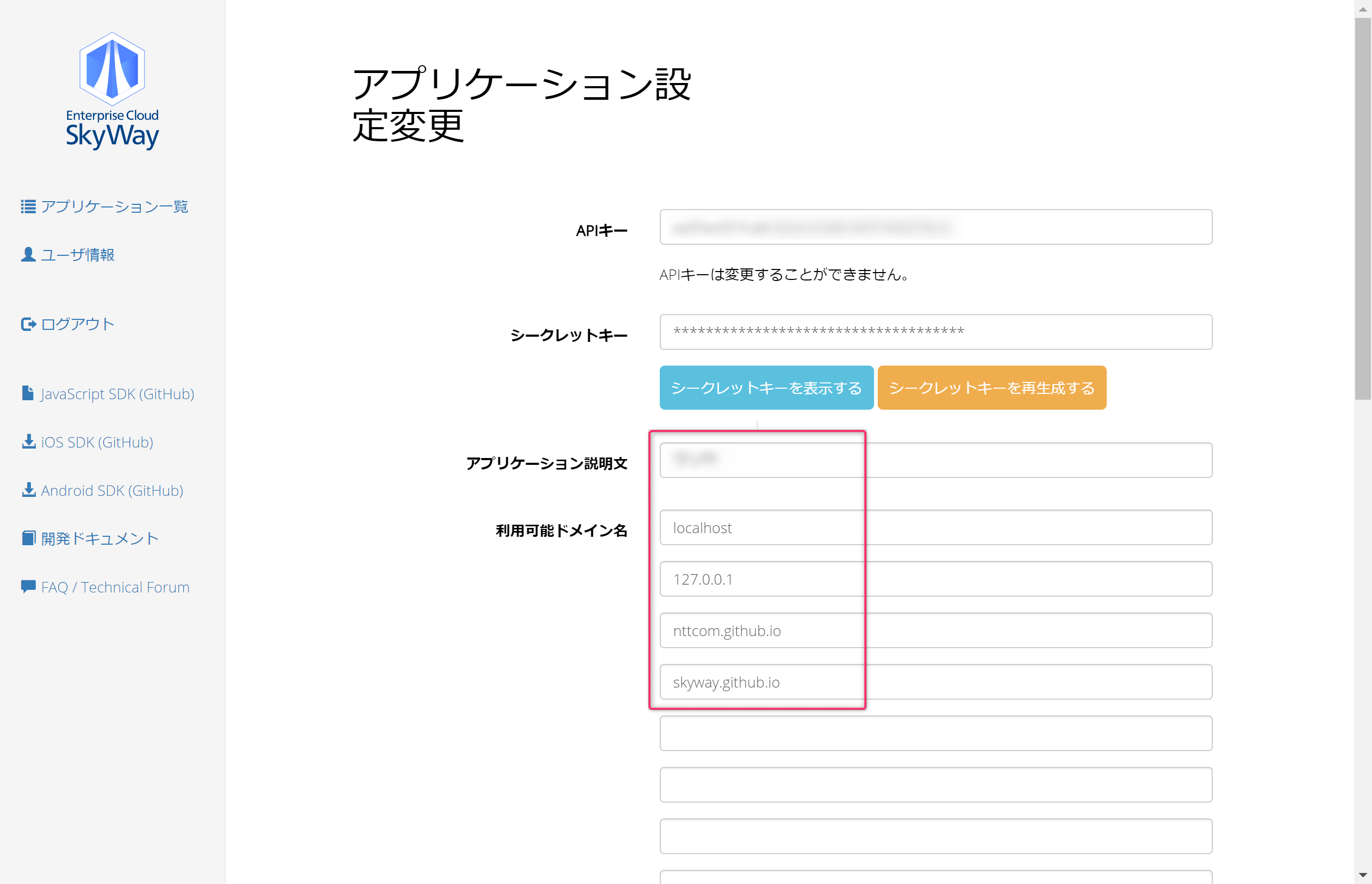 アプリケーションの説明欄には、管理しやすい文字列を登録し、利用可能ドメイン名には、アクセスを許可するドメインを登録します。後で、テストサイトで動作確認をするので、nttcom.github.ioとskyway.github.ioは登録しておくとよいと思います。