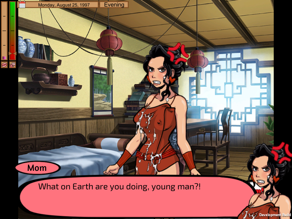 To characterize the mom, she starts out innocent and uptight so her "fall", so to speak, is more pronounced. She's also gullible and well-wishing enough to believe the pretexts the son uses to instigate the sex scenes. She can get angry at the son, because I think players want her to have resistance for them to overcome, but at the end of the day, she's also loving.