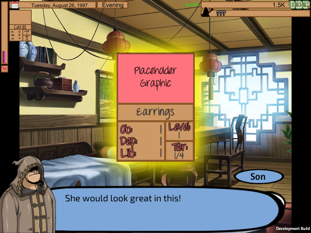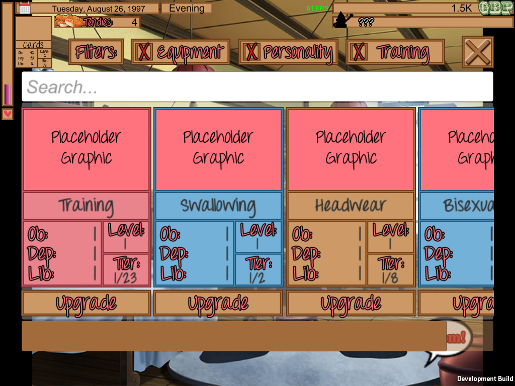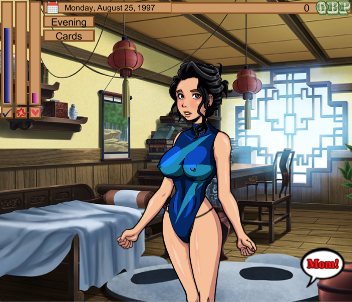 There is also programming-related news. The mom will now more intelligently tint her clothing so that the colors are more likely to match, reducing the likelihood of fashion disasters. The card collection system mentioned in the previous blogpost has been more fully fleshed out, and is set to be an integral part of the game's progression system. With these cards, you will be able to permanently unlock clothing and personality changes for the mom, as well as the main series of sex scenes.Lastly, we are still interested in working with more programmers, artists, and especially writers because there are still many scenes left to write. If you think you have what it takes, please feel free to email me at tyroflux@gmail.com, preferably with some examples of your other work.