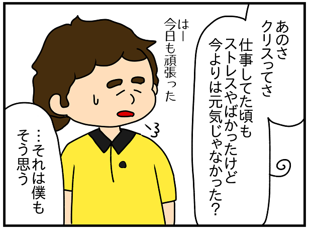 もうたくさんの人がこのお話が始まってすぐに「仕事を辞めたことでクリスの自己肯定感が下がってしまったのがマズイ」ってコメントをくれたんだけど、ようやくこの辺りからそのことに気付き始めました。