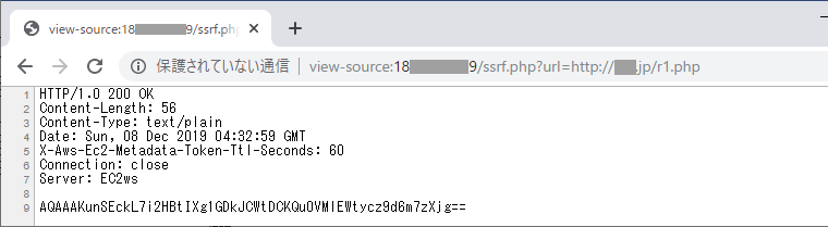 先程のサンプルプログラムをEC2のIMDSv1を無効化した環境に設置した状態で、Gopherプロトコルを用いて攻撃してみましょう。まずはPUTメソッドによるトークン取り出しです。表示が見やすいようにHTMLソースの形で表示しています。アドレスバーには gopher://169.254.169.254:80/_PUT というURLがちらっと見えていますね。このトークン(有効時間は60秒…もっと長くすることも可能)を用いて、メタデータを表示させた結果が下記です。