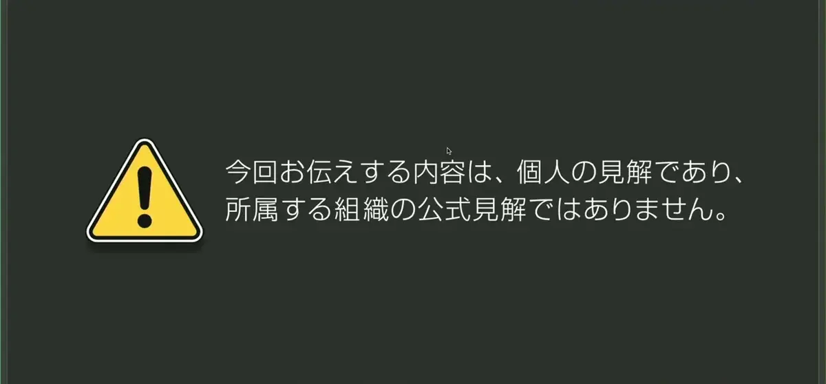 今回お伝えする内容は、あくまでも個人の見解であって、所属する組織の公式な見解ではないので予めご承知ください。