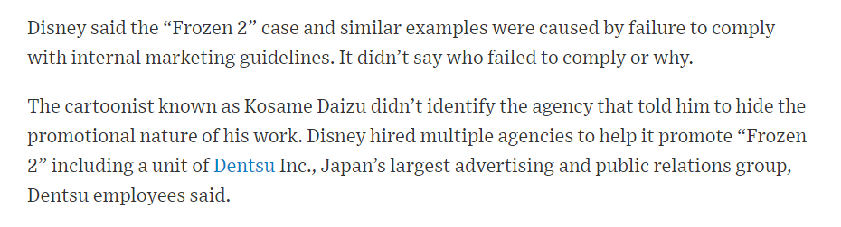 アナ雪ツイート騒動、続報です。複数の電通社員は自社の関与を認めました。参加した漫画家は「PR表記をつけないよう依頼」とステルスだったことを告白。WSJは電通、ディズニージャパン及びディズニー本社に「誰の発案だったのか」問い合わせていますが、一切反応がありません。https://www.wsj.com/articles/disney-accused-of-snow-job-over-frozen-2-tweet-apology-11576127949?shareToken=st7449b0164b3840bea1468ce22d897a92 …
