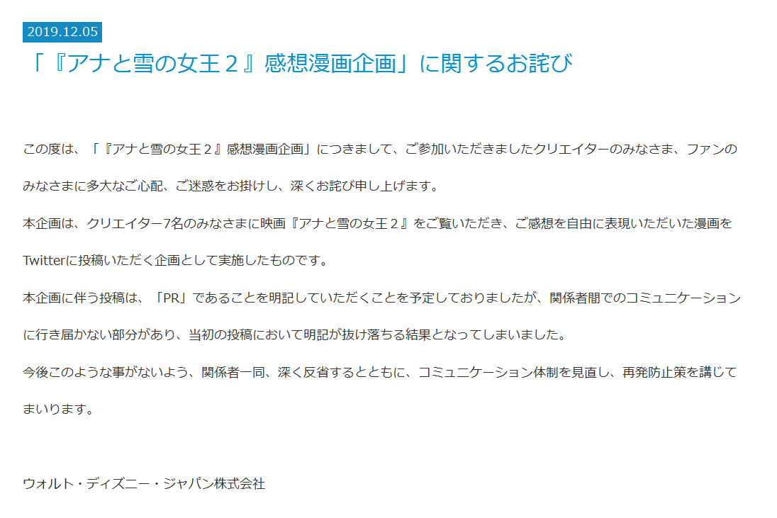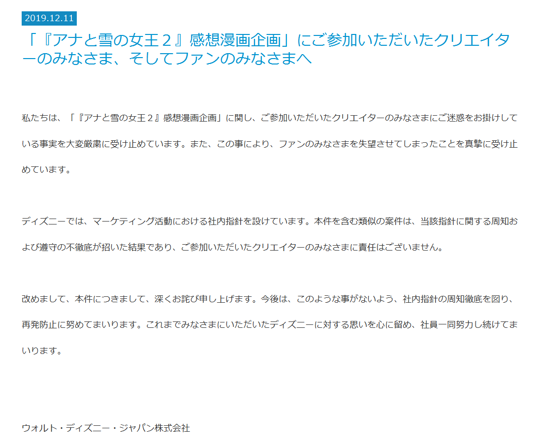 「『アナと雪の女王2』感想漫画企画」に関するお詫び|企業情報|ディズニー公式 https://www.disney.co.jp/corporate/news/2019/20191205.html …濁さんの他のツイートを見る