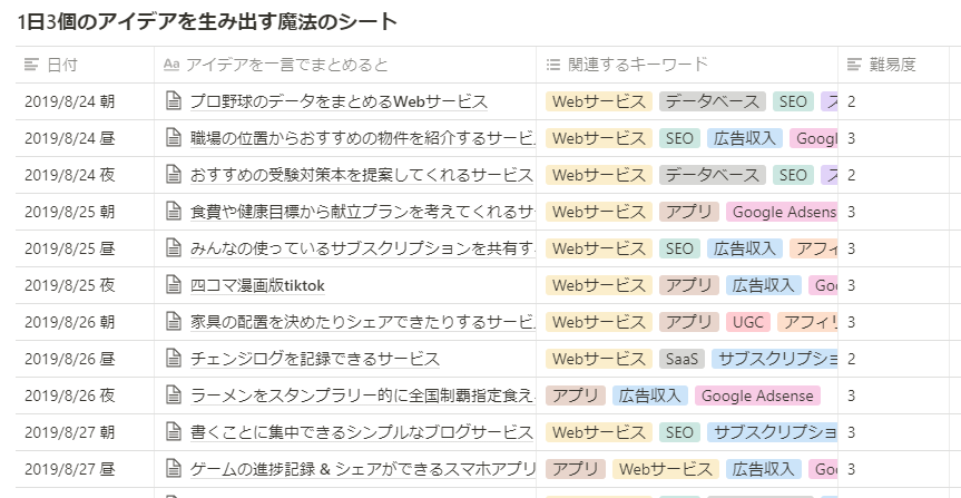 上の画像は以前僕がNotionでまとめていたシートの例です。この時は「1日3個のアイデアを生み出す魔法のシート」と名付けて、どんなにしょぼいようなアイデアでも毎日朝・昼・晩の3個出してメモし続けるようにしていました。