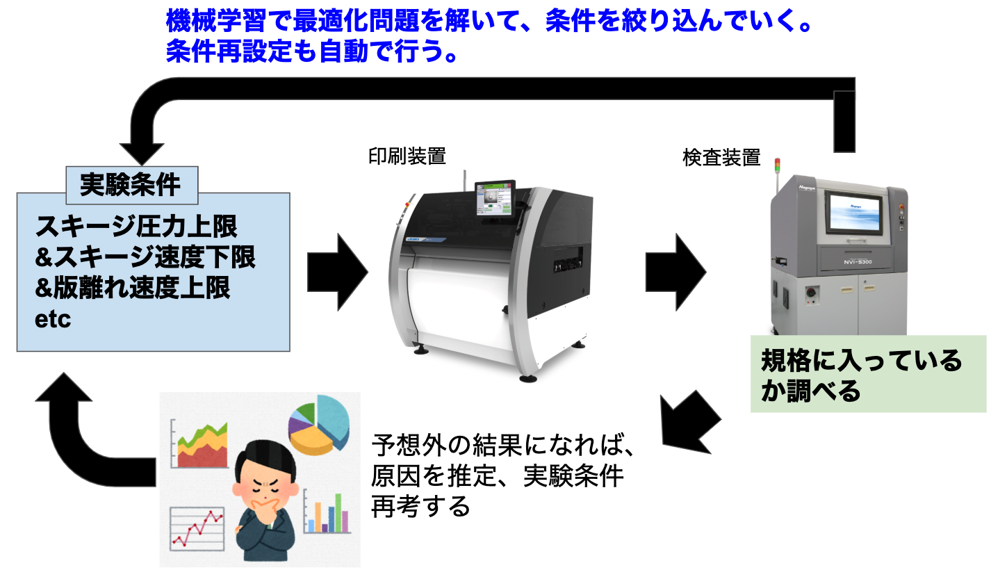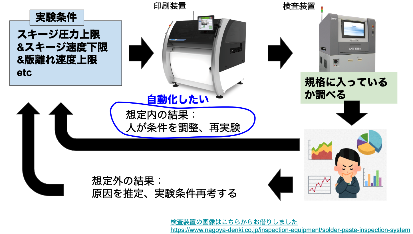 上記2,3はパラメーターを説明変数、出来栄えを目的変数とした最適化問題なので機械学習で代替できるのでは?と考えました。4の場合は、把握できてないパラメーターがあるということなので1からやり直します。自動化することで、現状人にしかできないA. 新たな工法の開発に使える時間が増えるというメリットがあります。自動化した後のイメージは以下です。
