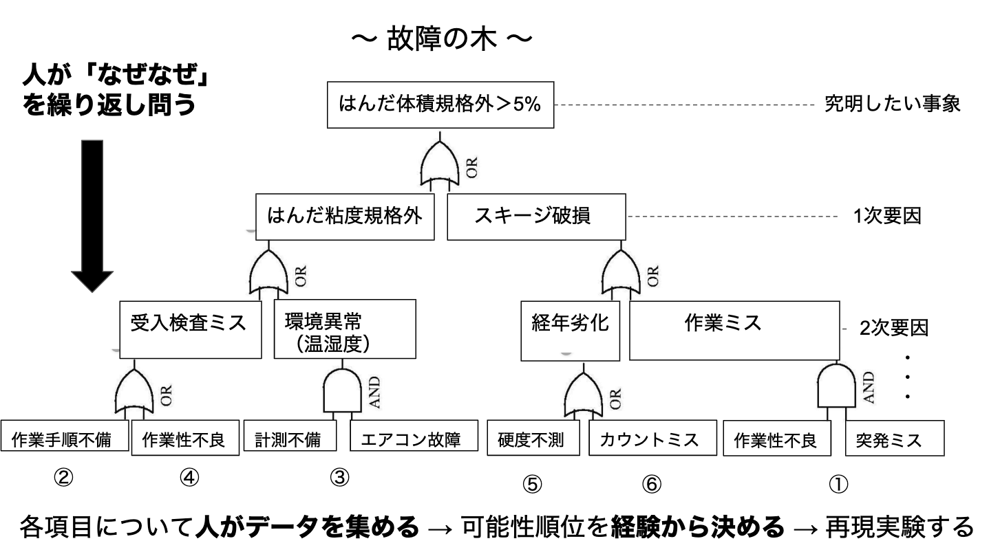 この業務は時間との戦い(納期が迫る→営業からのプレッシャー、ラインが遊ぶ→コストが嵩む)になるため、データ分析や機械学習に最も助けてもらいたい仕事です。製造ラインで異常事態(不良多発や装置トラブル)が起こると、ラインを休止し原因調査と対策を施す必要があります。原因調査の方法として、信頼性工学に基づくFTA(故障の木解析)という方法が用いられます。これは、故障という親事象からスタートして、その事例が起こる要因は何か、またその要因が起こる要因は何か、、、を繰り返し自問自答します。そうすることで、背後にある本質的な要因に辿り着こうというものです。異常が発生すると緊急会議が開かれ、皆で意見を出し合います。5次要因くらいまで洗い出した後、その中で可能性の順位を決めます(過去事例と経験から)。上位の要因から、不良が再現できるか確認していきます。再現できれば、その要因を潰す対策を打ちます。このフローを早く回す必要がありますが、要因を検証するためのデータで定常的に集計していないものは現場へデータを取りに行くことになります(装置ログが多かったです、、)。そして、担当者が急いでデータを集計、可視化し、会議再会という流れになります。慌て振りが目に浮かびます(笑)この時間の使い方はもったいないです。