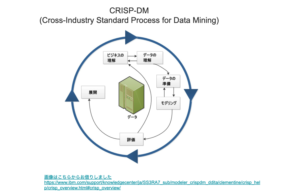 転職した当初は、「データ分析や機械学習が使える生産技術者」を目指していました。しかし、今は「製造業においてデータ分析や機械学習活用を指南できる人間」を目指しています。このように考えが変わった理由をCRISP-DMを例に説明したいと思います。CRISP-DMはデータ分析の業界横断型の標準プロセスで、下記の図のように「ビジネスの理解→データの理解→データの準備→モデル構築→評価→展開」のフローからなります。