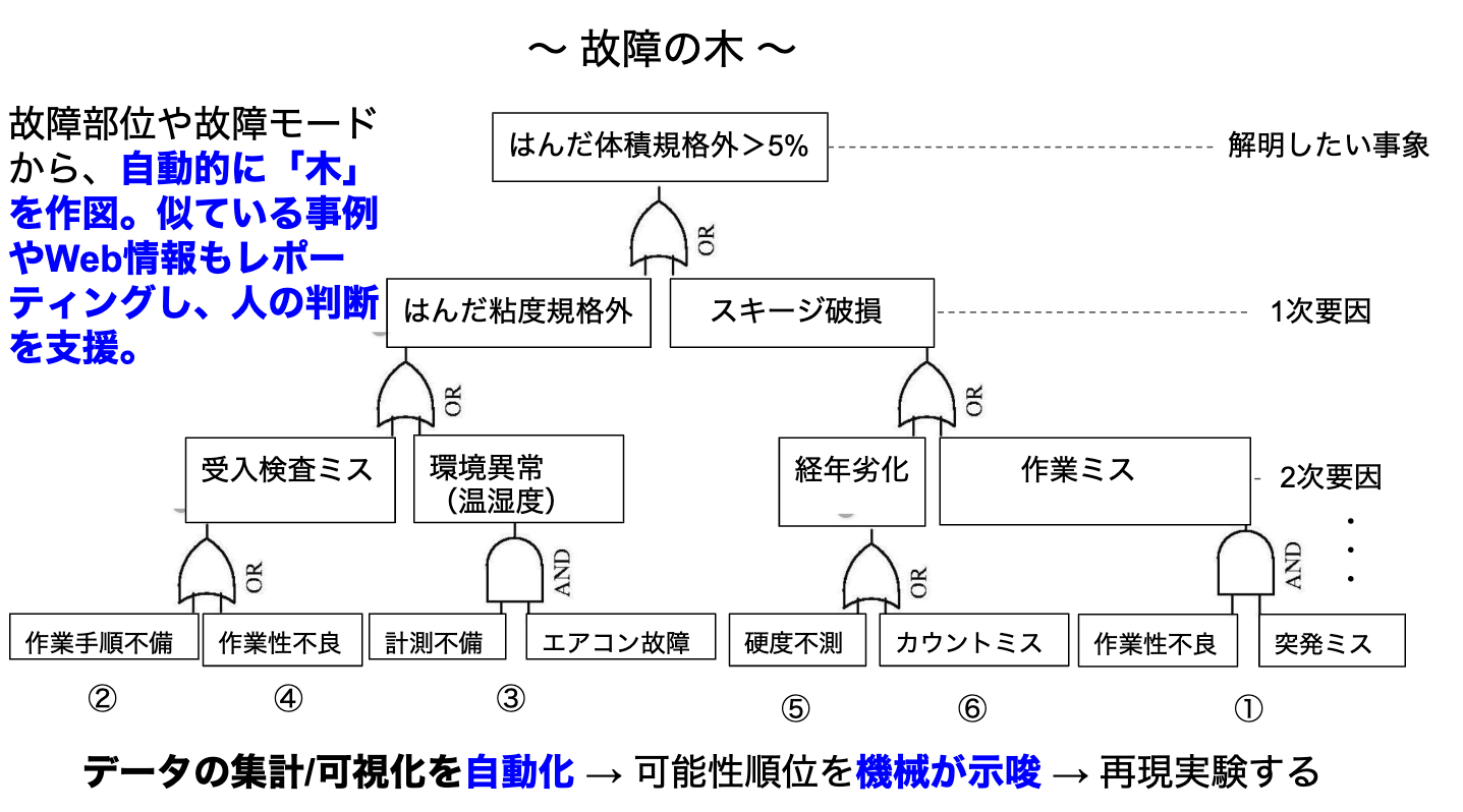 こういう切羽詰まった状況でこそ、IoTやBIツールを活用してデータの集計/可視化を自動化したいです(少なくとも過去に不良要因となった項目は)。また、故障箇所や故障モード、過去事例から故障の木作図までを自動化できないかと考えています(自問自答はかなりハードル高そうですが、、)。これができれば、可能性順位を決めるまでの時間が大幅に短縮でき、原因特定までの時間を大きく短縮できると思います。社内の過去事例やWeb情報から順位を示唆することもできるかもしれません。