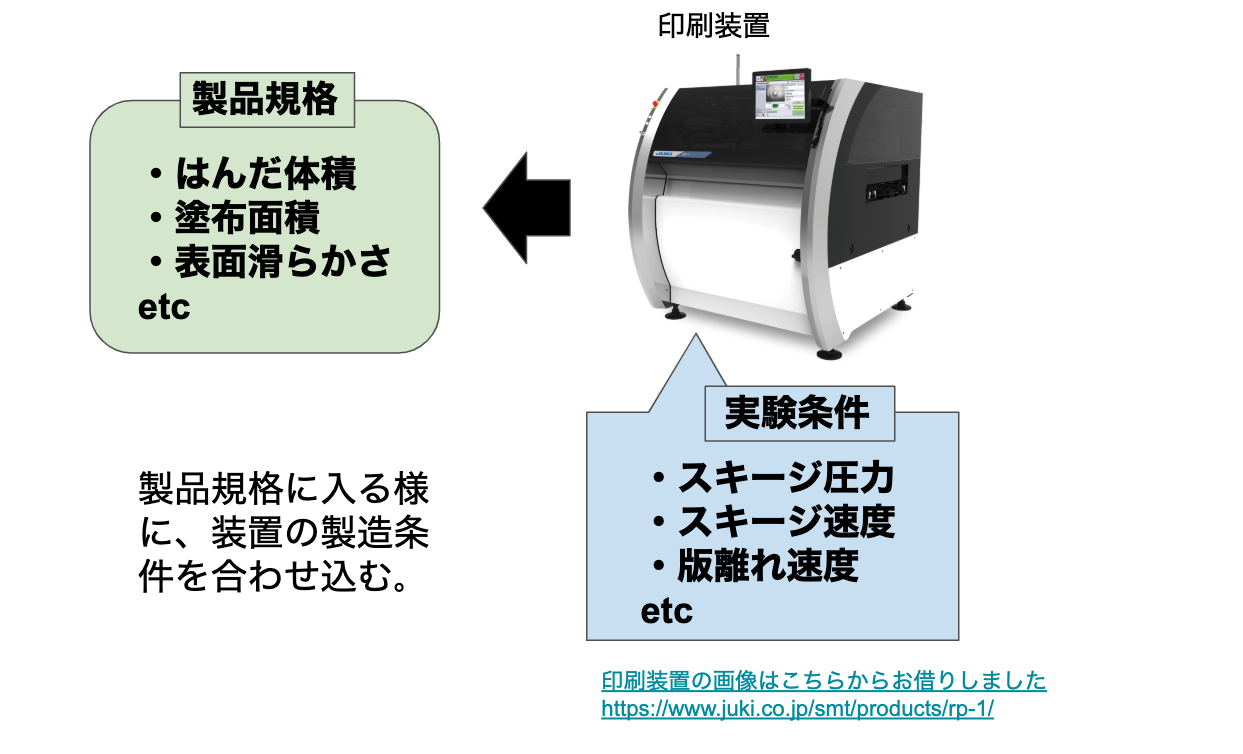 私が担当していた工程に、基板に半田ペーストを印刷する工程がありました。半田の体積や面積が製品規格に入るように製造条件(装置の設定値)を決める仕事です。その際、十分な工程能力を確保できるよう、条件を決めます。実験計画法を用いてなるべく効率的に実験しますが、影響するパラメーターが多く、(装置状態、はんだの粘性や、温度、湿度等)結構な回数の実験が必要になります。影響すると思われる全てのパラメーターの上下限値を見極めます。逆に言うと、規格を外す閾値を見極めるわけです。