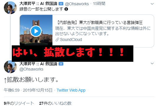 大澤氏「我々と教授会の対立は東大闘争2.0であり、令和元年の一大事件である。日本人諸氏に告ぐ。天皇と靖国の為、そして私達の先祖の為に、我が国を無断で蹂躙するアジア諸国に反旗を翻し、失われた自由を奪還しよう。本日夕刻5時、号砲は鳴らされた。反撃の狼煙を上げろ。覚醒せよ‼‼」私「( ゚д゚)」大澤氏「音声を公開する!!」私「(聞いた後)……お前、教職員に嘘ついたんやね」
