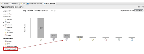 STATのレポート機能に「People also ask (Google)」というものがある。その名のとおりだ。ツールでトラッキングすることに決めたキーワードについて、表示されるPAAの質問とリストアップされるURLを、PAAボックス内の正確な順位とあわせて教えてくれる。