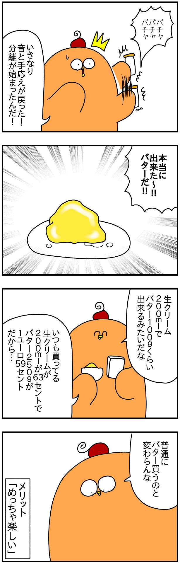 生クリーム200ml(出来るバター約100g)が63セント(約75円)、バター250gが1ユーロ59セント(約190円)って書いたけど、出来るバターは結構毎回量がバラバラ(120gくらい出来たりする時もある)から、場合によっては少しだけお得かも??