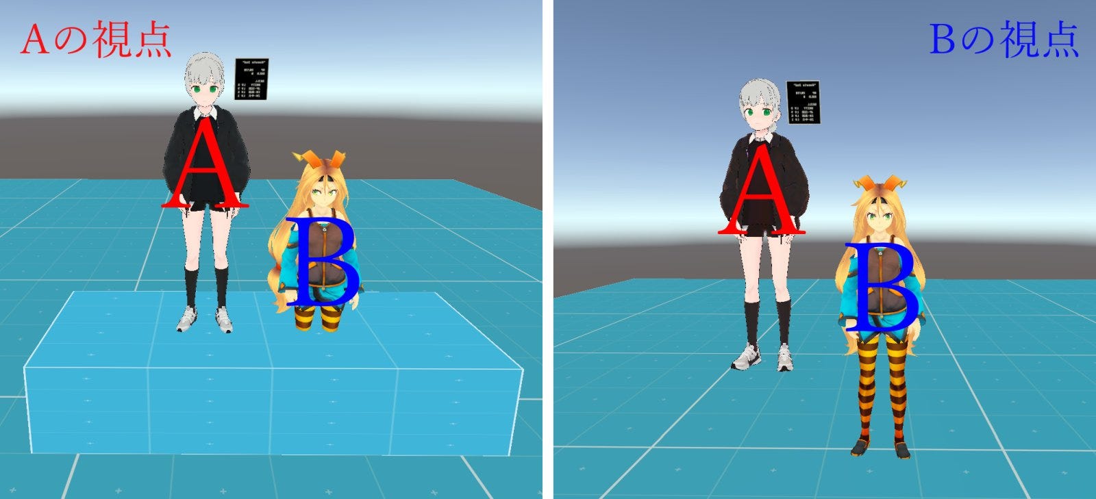 なぜこうなるのか? いまAは古いワールドデータを読み込んでいて、踏み台のあるワールドをローカルPCのクライアント上で再生している。Bは新しいワールドデータを読み込んでいて、踏み台のないワールドをローカルPCのクライアント上で再生している。その上で同じインスタンスにいる(=プレイヤーの位置同期が行われる)ので、Bから見たAが宙に浮いて見えるのだ。ワールドデータも、アバターデータも、プレイヤー位置も、プレイヤー音声も、実はまったく別々の要素で、それらをうまく同期させて同じ世界にいるように「見せかけて」いるにすぎない。上の例では違うワールドデータを読み込ませてみたが、このように再生するデータが少しズレただけで、プレイヤー間でまったく違う光景を見ることになるのだ。