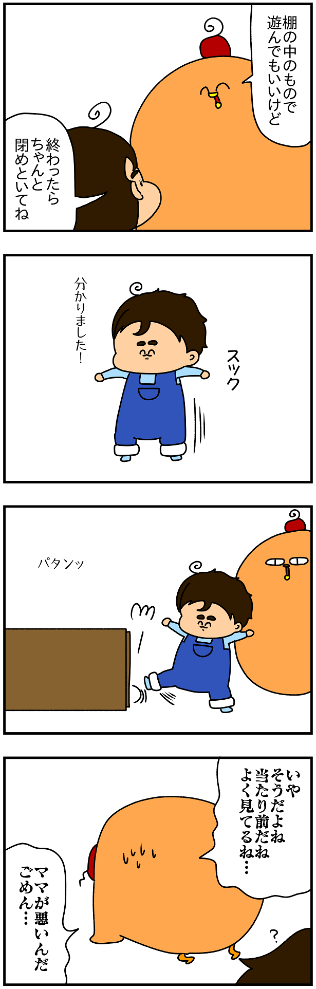 2020年01月04日 1046.親は!子の!鑑!!!! Dobrý den!何も考えず行ったアクションを子供はよーっく見てる。本当に見てる。足元にあるタイプの棚なので、ついつい足で閉めてしまいがち…。「閉めてね」って言ったらわざわざ立ち上がって足で閉めたので、完全に足で閉めるのがスタンダードだと思い込んでる。そりゃそーだよね。ママがそうやってるの見たもんね。いかんいかん…わたしの日常のあらゆるアクションが適当なので油断出来ない…。パパが鑑の息子のお話↓ ↓ぱんてゃがいい鑑になれるようクリックで応援してください!!(クリックは一日一回有効らしいです!)絵日記ランキング 「フリッツ君」カテゴリの最新記事 1043おまけ.ここ数年食べられないやつ 1043.アンパンマンのキャラクターの謎 1042おまけ.親父にもぶたれたことないのに 1042.フリちゃん「Spielgruppe」デビュー 1036おまけ.フリちゃん「なにい!?」 タグ :フリッツ君アホ < 前の記事 コメント コメント一覧 (2) 1. ぱん友 2020年01月04日 07:26 フリちゃんのおもちゃ棚?にふわふわパンケーキがあるー! ケンタッキービスケットの記事見て明日の朝食用にスコーン買って来たけど、ふわふわパンケーキも食べたくなりました。 最近のブログはおいしそうなネタが多くてクリスマス〜年末年始で体重増加した私みたいな人には危険ですね。食べるけど。 0 2. ぱんてゃ 2020年01月04日 08:26 >>1 最後の一言が清々しくて好きwww 0 コメントフォーム 名前 コメント 記事の評価 リセット リセット 顔 星 情報を記憶 コメントを投稿する